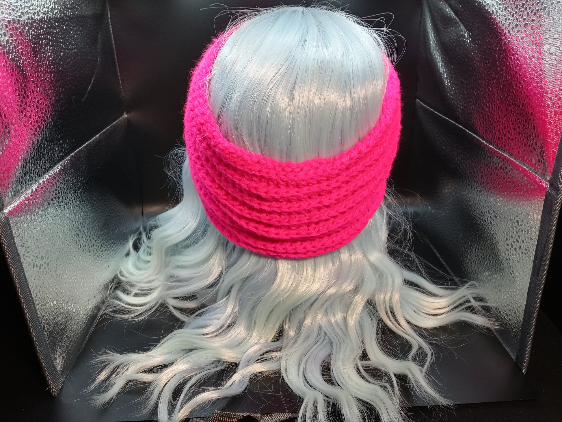 For those that need a bright pop of color in their wardrobe, this earwarmer is perfect! Made with loud neon pink acrylic yarn, this warm headwear is bound to liven up cold winter days! Will fit a 22" head comfortably.